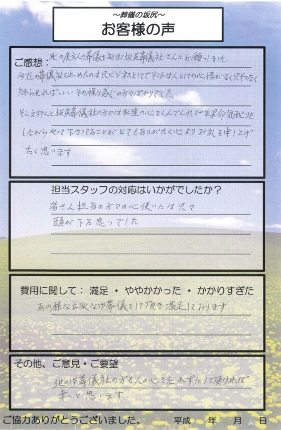 そこえ行くと坂尻葬儀社の方々は私達の心をくんでくれて一生懸命気配りをやって下さってることがとてもありがたく心よりお礼を申し上げたく思います。